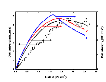 ![]() | Field dependence of the electron drift velocity, 77 K. Solid lines show results of theoretical calculation for different non-parabolicity α (eV-1): 1. 2.85; 2. 2.0; 3. 1.5. Points show experimental results for very short (pico-second pulses) |